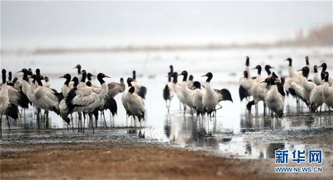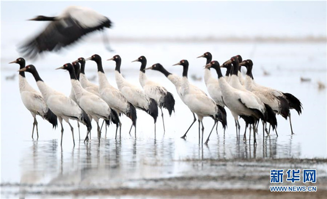 2月21日在草海國(guó)家級(jí)自然保護(hù)區(qū)內(nèi)拍攝的黑頸鶴。新華社記者楊楹攝