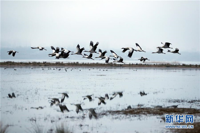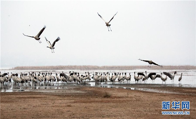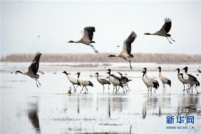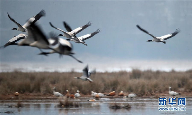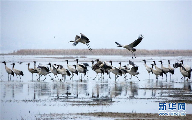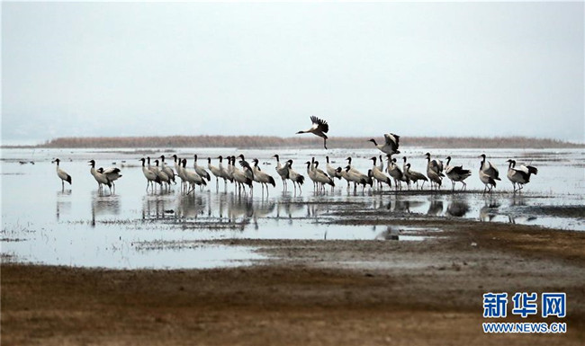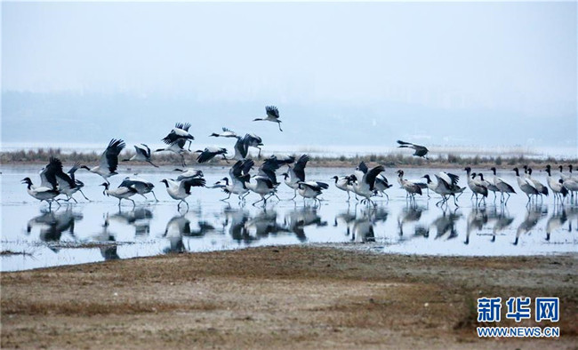 草海保護(hù)區(qū)是黑頸鶴越冬的主要棲息地之一,其在草海越冬期約為每年10月下旬到次年3月底。黑頸鶴是全球唯一在高原生長(zhǎng)、繁殖的鶴類。新華社記者楊楹攝