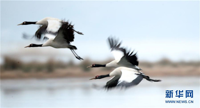2月21日在草海國(guó)家級(jí)自然保護(hù)區(qū)內(nèi)拍攝的黑頸鶴。新華社發(fā)(胡攀學(xué)攝)