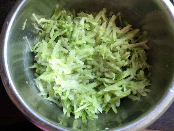2.用刨子刨成細(xì)絲,加點(diǎn)鹽腌一下出水
