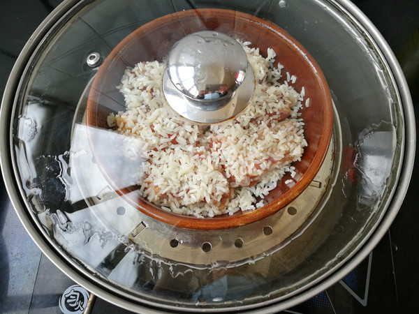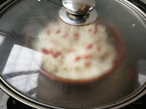 6.大火燒開水,把排骨糯米蒸一小時(shí)左右,再撒入枸杞子,再燜蒸30分鐘