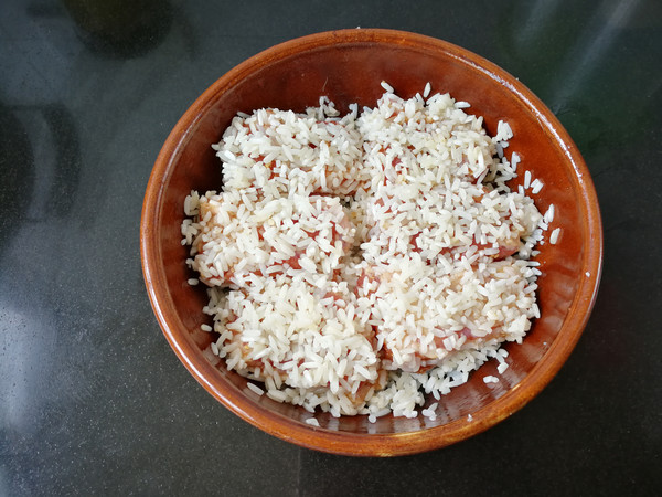 4.把泡透的糯米先放一層在盤底,再放上腌過的排骨,把余下的糯米撒在上面