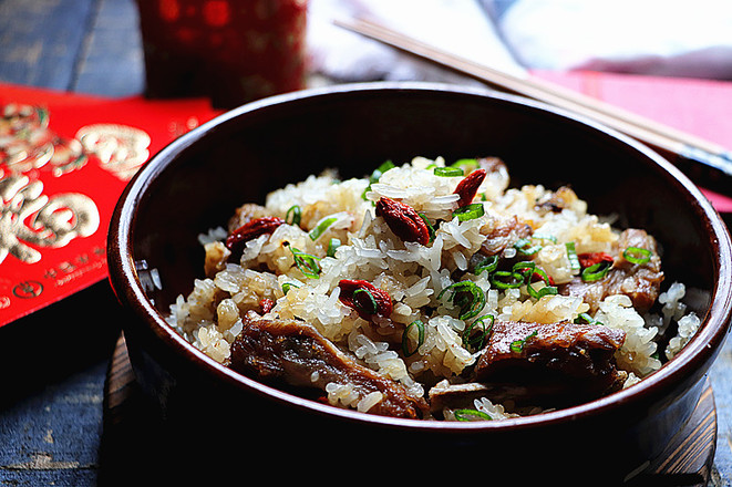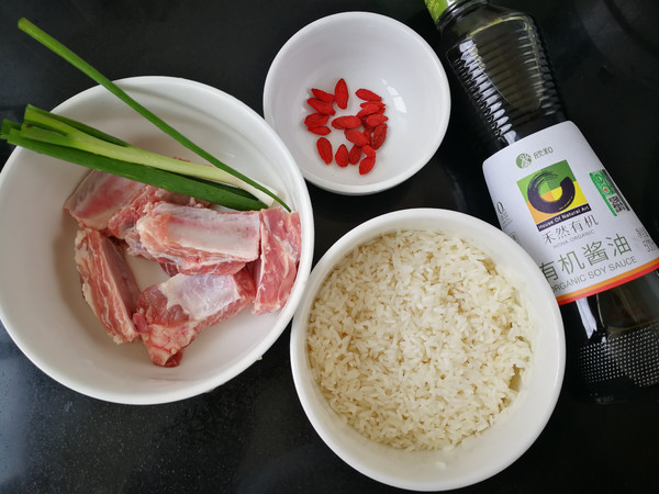 主料:排骨250克  糯米150克  枸杞子10克  小蔥10克  花生油10克  姜粉5克