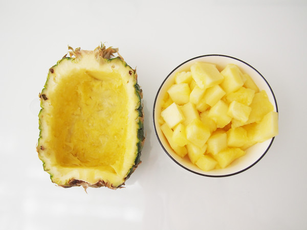 5.等待蒸米飯的時候,準備其他食材。將菠蘿果肉挖出來,切成丁