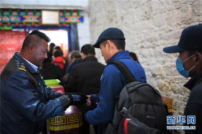 布達拉宮的安檢人員在核對參觀者的門票、身份證件等(2018年11月15日攝)。  新華社記者 普布扎西 攝