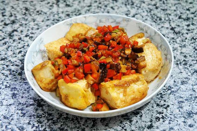 主料:豆腐10小塊 紅椒半個 青椒半個 香菇2朵