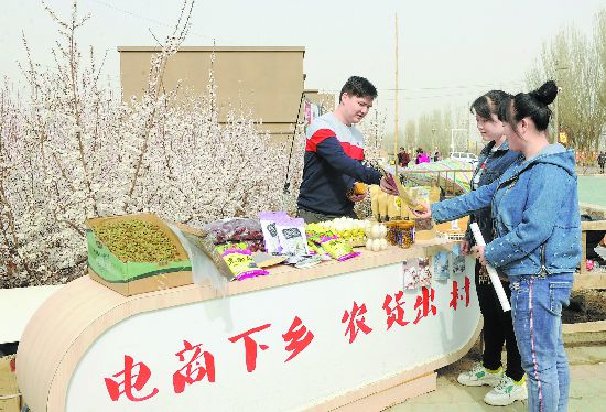 3月23日,新疆托克遜縣夏鄉(xiāng)南湖村電子商務(wù)服務(wù)點(diǎn)的工作人員在為游客介紹當(dāng)?shù)氐奶厣r(nóng)產(chǎn)品。 近年來(lái),托克遜縣通過(guò)構(gòu)建電子商務(wù)培訓(xùn)體系、農(nóng)產(chǎn)品營(yíng)銷體系等,幫助當(dāng)?shù)剞r(nóng)民開設(shè)網(wǎng)店,尋找代銷產(chǎn)品、入駐網(wǎng)絡(luò)銷售平臺(tái),引領(lǐng)農(nóng)民走上致富路。(秦梅花)