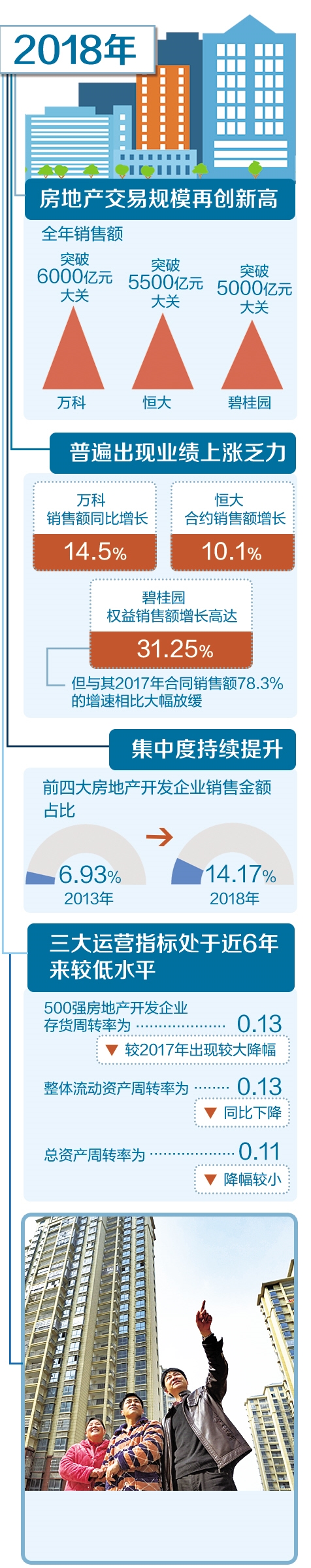 2018年,房地產(chǎn)交易規(guī)模再創(chuàng)新高,萬(wàn)科、恒大、碧桂園全年銷(xiāo)售額紛紛突破6000億元、5500億元、5000億元大關(guān)。但在調(diào)控政策從緊的環(huán)境下,房企普遍出現(xiàn)業(yè)績(jī)上漲乏力現(xiàn)象。年報(bào)顯示,2018年萬(wàn)科銷(xiāo)售額同比增長(zhǎng)14.5%,恒大合約銷(xiāo)售額增長(zhǎng)10.1%,增速同比均有所放緩。雖然2018年碧桂園權(quán)益銷(xiāo)售額增長(zhǎng)高達(dá)31.25%,但與其2017年合同銷(xiāo)售額78.3%的增速相比亦大幅放緩。