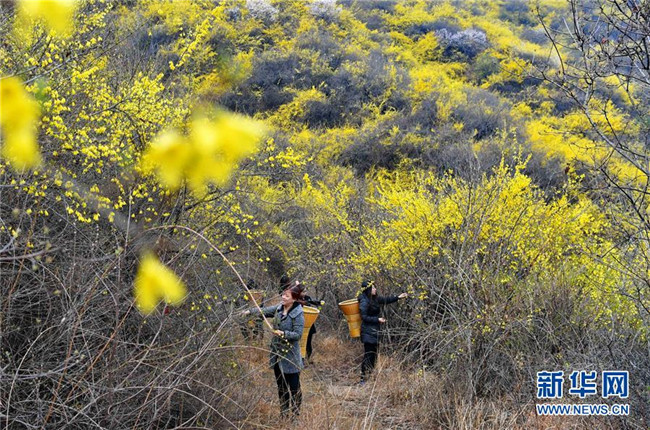 4月10日,平定縣冠山鎮(zhèn)后溝村的村民在采摘連翹葉。