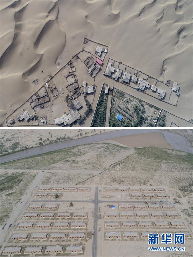 拼版照片:上圖為新疆于田縣達里雅布依鄉(xiāng)的民居(2018年9月7日攝);下圖為達里雅布依小鎮(zhèn)易地扶貧安置點的房屋(2019年3月20日攝)。新華社記者 胡虎虎 攝