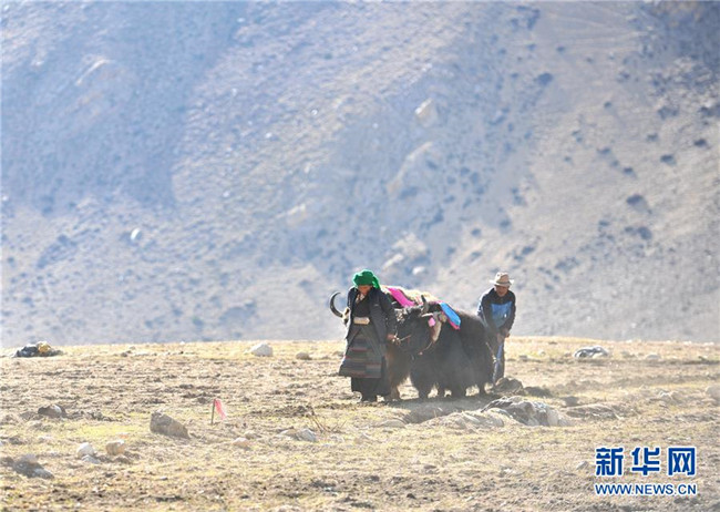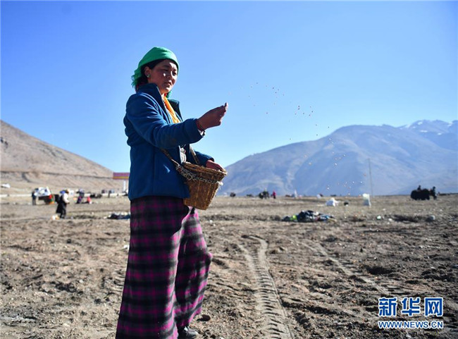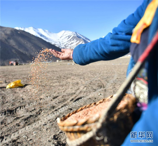4月26日,日喀則市聶拉木縣崗嘎村村民在播種青稞。 新華社記者 晉美多吉 攝