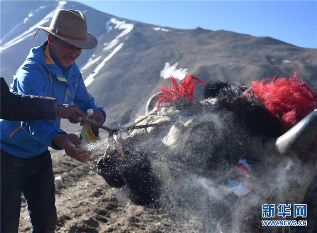 4月26日,西藏日喀則市聶拉木縣崗嘎村村民在給耕牛喂糌粑。 新華社記者 晉美多吉 攝
