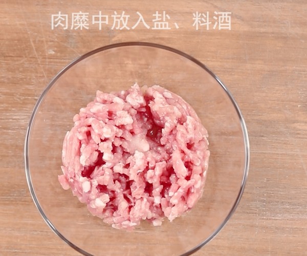 3.腌制肉沫放入鹽、料酒,腌制10分鐘左右