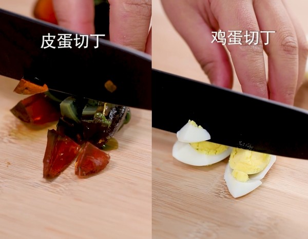 2.分別將雞蛋、咸鴨蛋、皮蛋切丁。