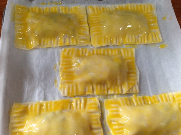 9.上面蓋上一組餛飩皮,四周壓緊粘合用叉子壓出花紋