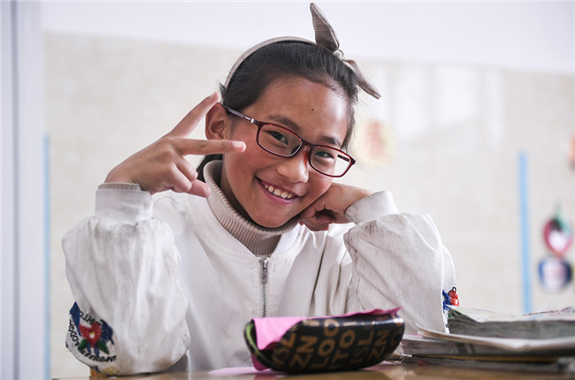 6月18日,戴上眼鏡的扎西旺姆在若爾蓋縣民族寄宿制小學(xué)的教室里。
