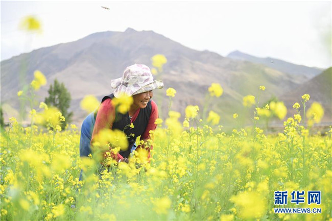 7月2日,拉薩市堆龍德慶區(qū)朗巴鄉(xiāng)村民玉珍在打理油菜花田。近日,西藏各地的油菜花盛開,呈現(xiàn)出生機(jī)勃勃的夏日美景。新華社記者晉美多吉攝