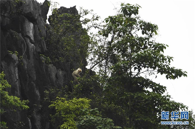 當(dāng)日,記者在廣西恩城國家級自然保護區(qū)邊緣的大新縣桃城鎮(zhèn)寶新村城南小學(xué)后山上拍攝到一只白化黑葉猴幼體。