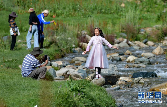 游人在達(dá)東村景區(qū)小溪邊玩耍(7月20日攝)。西藏拉薩市柳梧鄉(xiāng)達(dá)東村是一個千年古村,也曾是一個貧困村。近年來,依托秀美的自然風(fēng)光、深厚的歷史文化和淳樸的風(fēng)土人情,當(dāng)?shù)卣畬嵤┪幕糜萎a(chǎn)業(yè)精準(zhǔn)扶貧,使達(dá)東村蛻變成為鄉(xiāng)村旅游勝地。新華社記者張汝鋒攝