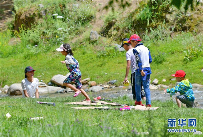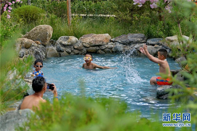 孩子們在達(dá)東村景區(qū)溫泉里嬉戲(7月20日攝)。西藏拉薩市柳梧鄉(xiāng)達(dá)東村是一個千年古村,也曾是一個貧困村。近年來,依托秀美的自然風(fēng)光、深厚的歷史文化和淳樸的風(fēng)土人情,當(dāng)?shù)卣畬嵤┪幕糜萎a(chǎn)業(yè)精準(zhǔn)扶貧,使達(dá)東村蛻變成為鄉(xiāng)村旅游勝地。新華社記者張汝鋒攝