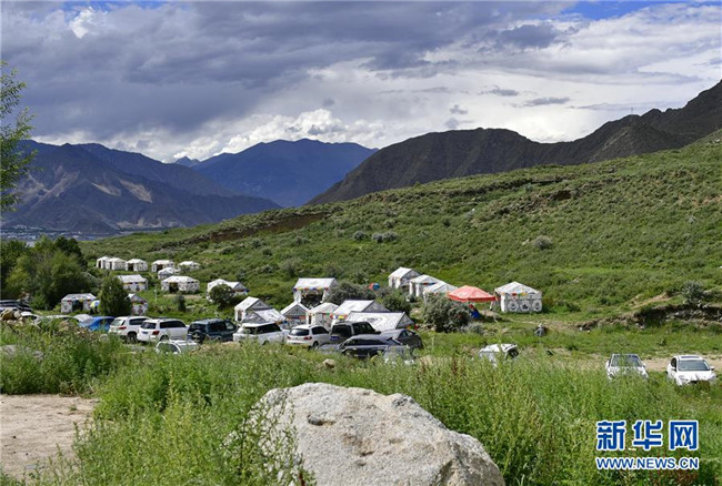 這是達(dá)東村景區(qū)的帳篷和旅游車輛(7月20日攝)。西藏拉薩市柳梧鄉(xiāng)達(dá)東村是一個千年古村,也曾是一個貧困村。近年來,依托秀美的自然風(fēng)光、深厚的歷史文化和淳樸的風(fēng)土人情,當(dāng)?shù)卣畬嵤┪幕糜萎a(chǎn)業(yè)精準(zhǔn)扶貧,使達(dá)東村蛻變成為鄉(xiāng)村旅游勝地。新華社記者張汝鋒攝