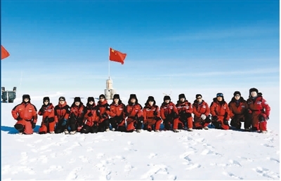 1月16日,中國第35次南極科考隊昆侖隊隊員來到海拔4093米的南極冰蓋最高點冰穹A,在南極冰蓋之巔換上了一面嶄新的國旗。圖為隊員們在此處合影。新華社記者 劉詩平攝