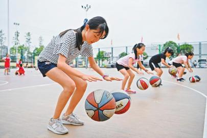 8月5日,南充小學(xué)生在操場上練習(xí)運球?! ”緢笥浾?楊樹 攝