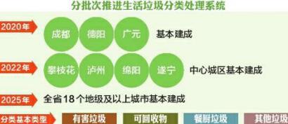 征求意見稿提出將加快建立分類投放、分類收集、分類運(yùn)輸、分類處置的生活垃圾處理系統(tǒng),促進(jìn)城鄉(xiāng)生活垃圾減量化、資源化、無(wú)害化,統(tǒng)籌推進(jìn)其他固體廢物處理處置,努力改善城鄉(xiāng)人居環(huán)境。到2020年,成都、德陽(yáng)、廣元3個(gè)國(guó)家重點(diǎn)城市基本建成生活垃圾分類處理系統(tǒng),生活垃圾回收利用率達(dá)到35%以上;到2022年,攀枝花、瀘州、綿陽(yáng)、遂寧4個(gè)省級(jí)示范城市的中心城區(qū)基本建成生活垃圾分類處理系統(tǒng);到2025年,全省18個(gè)地級(jí)及以上城市基本建成生活垃圾分類處理系統(tǒng)。