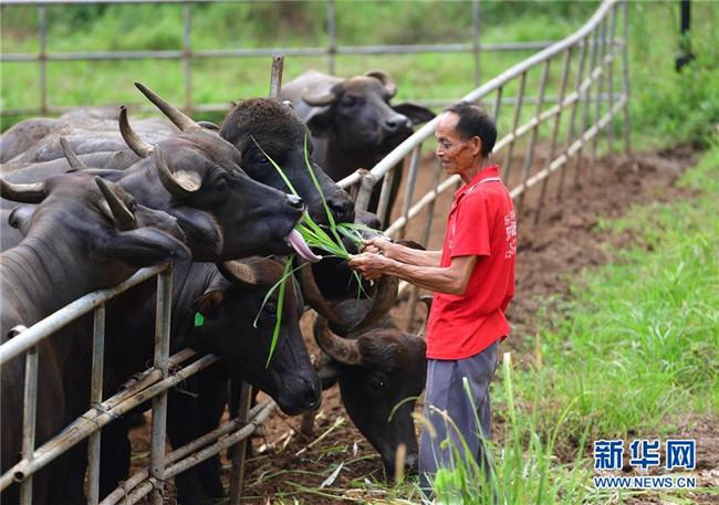 在廣西融安縣大良鎮(zhèn)古蘭村古蘭屯養(yǎng)?;?,68歲的韋肇翠在喂牛(8月18日攝)。韋肇翠是養(yǎng)?;氐娘曫B(yǎng)員,每個月有2800元的工資。 新華社記者 黃孝邦 攝