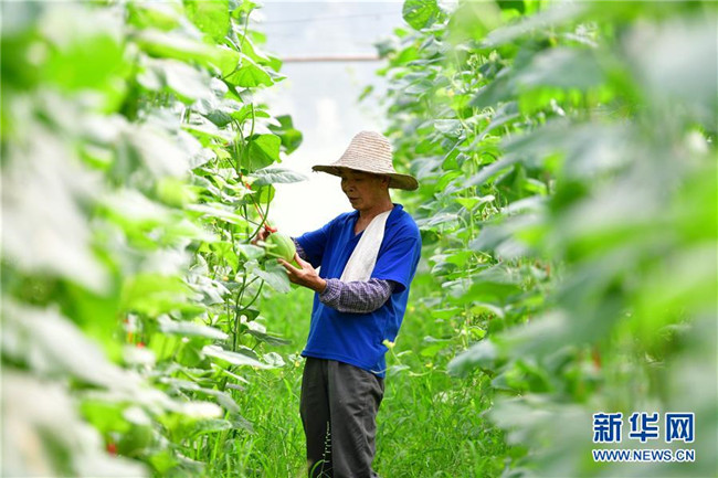 在廣西融安縣大良鎮(zhèn)古蘭村古蘭屯大棚基地,62歲的黃顯亮查看甜瓜生長情況(8月18日攝)。黃顯亮是大棚基地的技術(shù)員,每個月有3000多元的工資,已于2018年實現(xiàn)脫貧。 新華社記者 黃孝邦 攝
