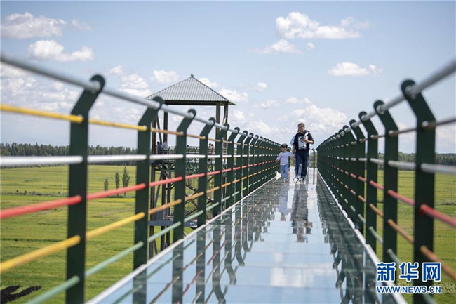 8月18日,游客在新疆察布查爾錫伯自治縣納達(dá)齊牛錄鄉(xiāng)稻田畫基地的玻璃棧道上賞景。