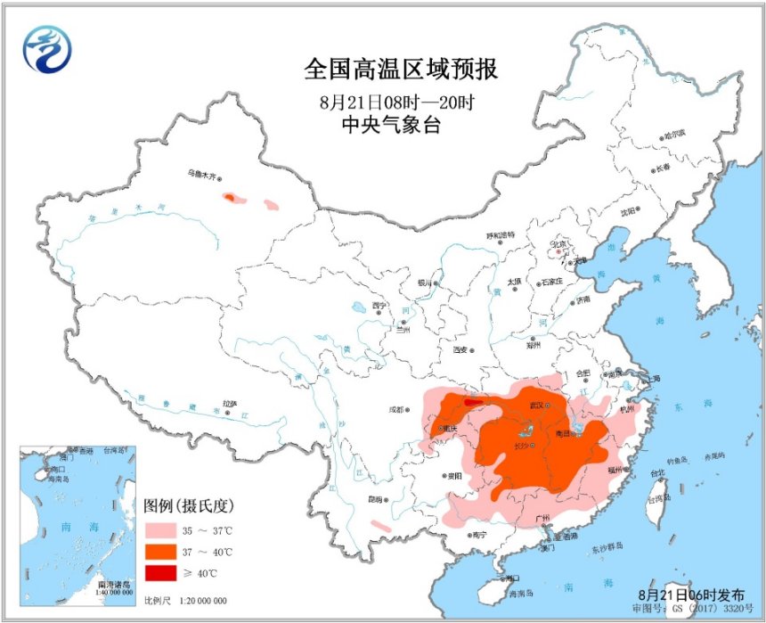 未來三天,西南地區(qū)東部、江漢、江南、華南中北部等地將有高溫天氣。中央氣象臺8月21日06時繼續(xù)發(fā)布高溫黃色預(yù)警。預(yù)計8月21日白天,江漢大部、江南大部、四川盆地東部、重慶、貴州東部、華南中北部等地最高氣溫35~36℃,其中,湖北中南部、湖南大部、江西大部、四川東北部、重慶大部、廣西東北部等地的部分地區(qū)最高氣溫37~39℃,重慶北部局地可達40℃以上。