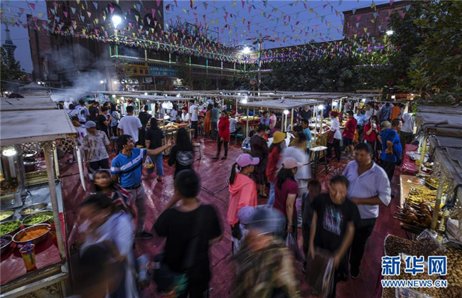 在新疆喀什市歐爾達(dá)路的夜市上,人們在選購品嘗美食(8月18日攝)。新華社記者 王菲 攝
