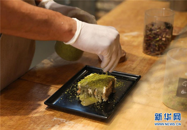 8月23日,在意大利首都羅馬的一家餐廳,一名廚師制作開(kāi)心果口味的提拉米蘇。