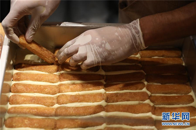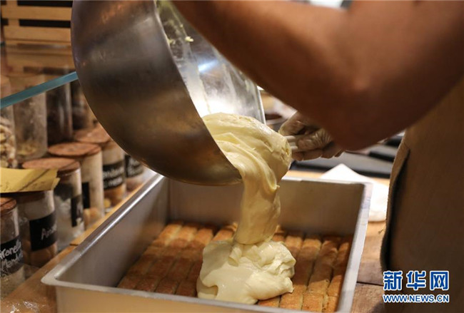 8月23日,在意大利首都羅馬的一家餐廳,一名廚師將制作好的奶酪糊覆蓋在浸泡過(guò)咖啡的手指餅干上。