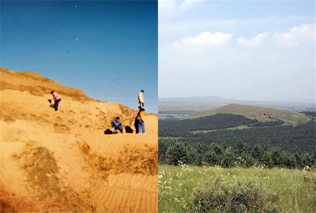 上世紀(jì)80年代的白二爺沙壩“除了黃沙就是黃沙”。如今,這里造林種草保存面積達(dá)12萬(wàn)畝,植被蓋度提高到75%以上。 左圖:白二爺沙壩治沙站辦公室供圖 右圖:人民網(wǎng)記者 王欲然攝
