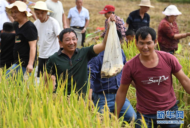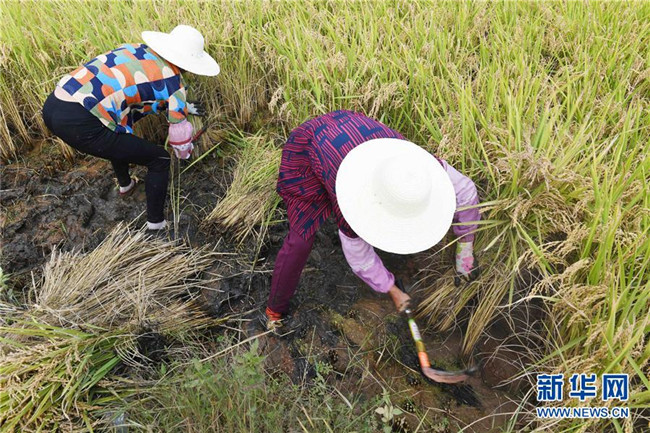 9月15日,云南尋甸回族彝族自治縣七星鎮(zhèn)魯古村的農(nóng)婦在參加割稻谷比賽。