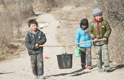 脫貧前,渭源縣元古堆村的孩子們從取水點抬水。攝于2013年3月。新華社記者 范培珅攝