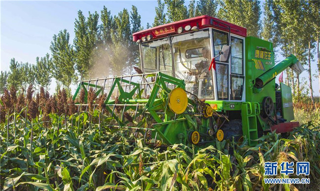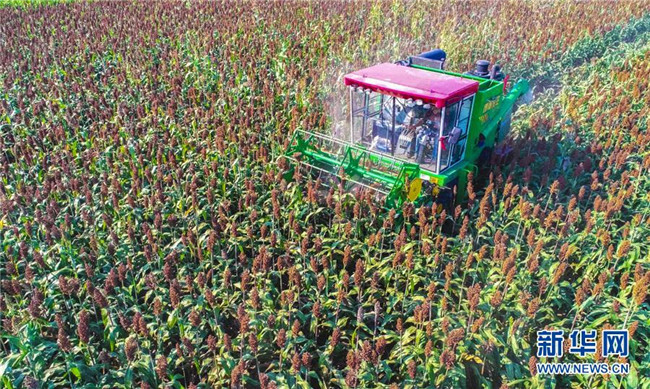 10月7日,在棗強(qiáng)縣肖張鎮(zhèn)西趙莊村,村民使用收割機(jī)收割高粱。 新華社記者 李曉果 攝