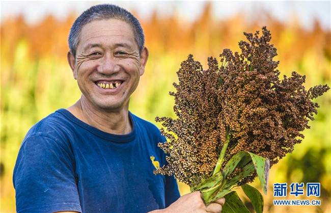 10月7日,在棗強(qiáng)縣肖張鎮(zhèn)西趙莊村,村民展示收獲的高粱。 新華社記者 李曉果 攝