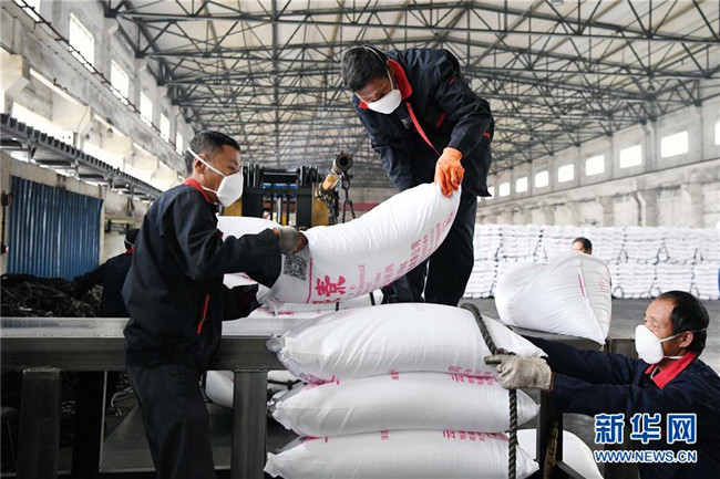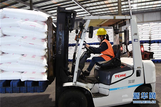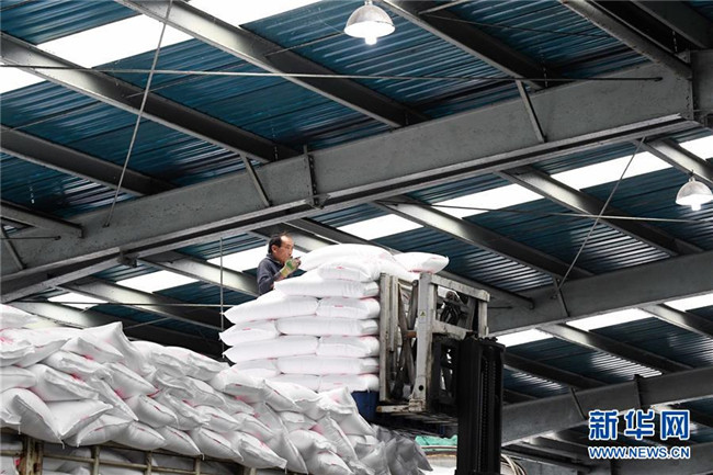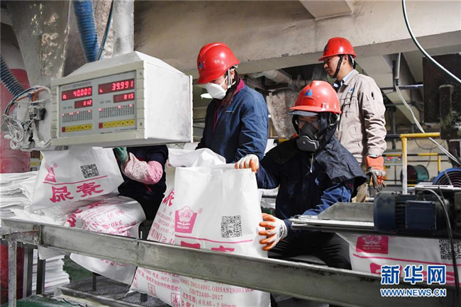 10月14日,轉移就業(yè)的農(nóng)民在云南省曲靖市沾益區(qū)花山街道勞務中心尿素包裝裝卸車間工作。