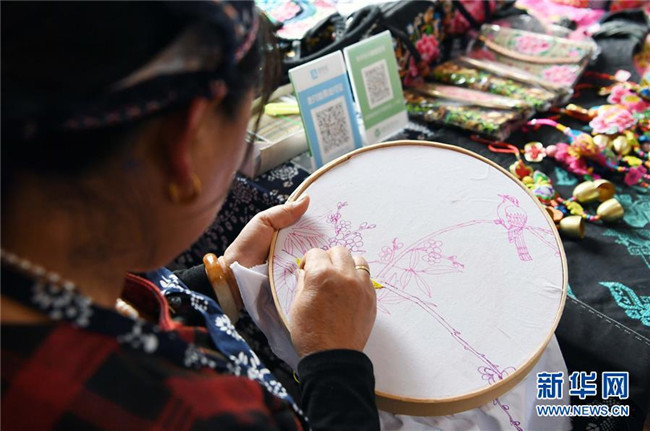 10月16日,團(tuán)結(jié)村的一名“巧媳婦”在刺繡。 新華社記者 楊宗友 攝