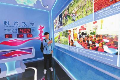 脫貧攻堅是幸福中國的生動詮釋。一塊脫貧攻堅倒計時422天的標識牌引發(fā)圍觀,展示的脫貧攻堅8項主要成果中,四川占有兩席。作為教育脫貧的成果,一張照片展現(xiàn)了涼山州昭覺縣幼教點輔導(dǎo)員帶領(lǐng)幼兒學(xué)習(xí)普通話的場景;嚴把貧困退出關(guān),另一張照片則展示了第三方評估團隊在甘孜州康定市開展貧困縣退出抽查的場景。