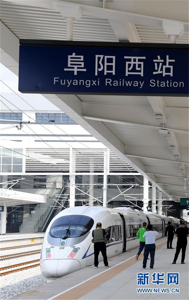 10月24日,一輛試運行列車??吭谏毯虾几哞F阜陽西站。 新華社記者劉軍喜攝
