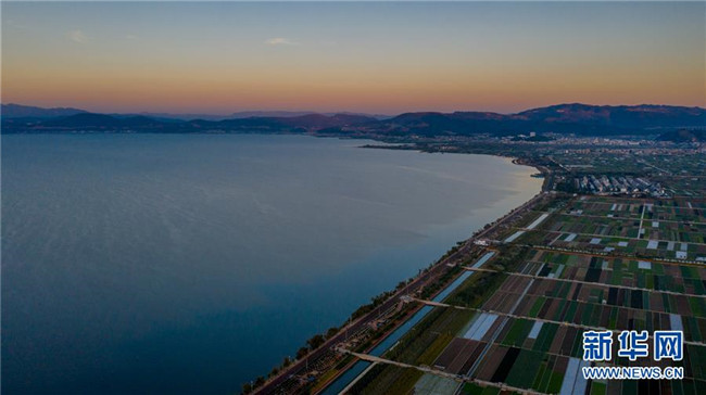 這是云南省玉溪市通??h的田園風(fēng)光(11月23日無(wú)人機(jī)拍攝)。初冬時(shí)節(jié),云南省玉溪市通??h風(fēng)景秀麗,山巒、湖水與農(nóng)田組成了一幅美麗的田園詩(shī)畫(huà)卷。新華社記者胡超攝