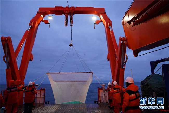 “雪龍2”號(hào)12月7日離開(kāi)南大洋普里茲灣海域向西航行,開(kāi)始對(duì)宇航員海海域展開(kāi)科考作業(yè)??瓶缄?duì)員沿著本次宇航員??瓶嫉氖讉€(gè)調(diào)查斷面,自北向南做了多個(gè)站位的CTD(海水溫鹽深測(cè)量?jī)x)采水作業(yè)、浮游生物垂直拖網(wǎng)作業(yè),以及魚(yú)類拖網(wǎng)和箱式采樣器等采樣作業(yè)。
