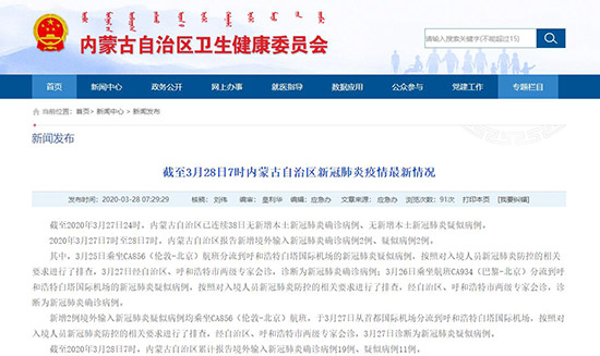 2020年3月27日7時(shí)至28日7時(shí),內(nèi)蒙古自治區(qū)報(bào)告新增境外輸入新冠肺炎確診病例2例、疑似病例2例。