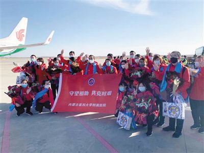 內(nèi)蒙古醫(yī)科大學(xué)附屬醫(yī)院的援鄂醫(yī)護人員在合影留念。