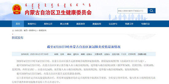 人民網(wǎng)呼和浩特4月23日電 (陳立庚)4月23日,記者從內(nèi)蒙古自治區(qū)衛(wèi)生健康委員會獲悉,2020年4月22日7時(shí)至4月23日7時(shí),內(nèi)蒙古自治區(qū)報(bào)告無新增確診病例和疑似病例,排除疑似病例7例(由滿洲里市口岸入境)。