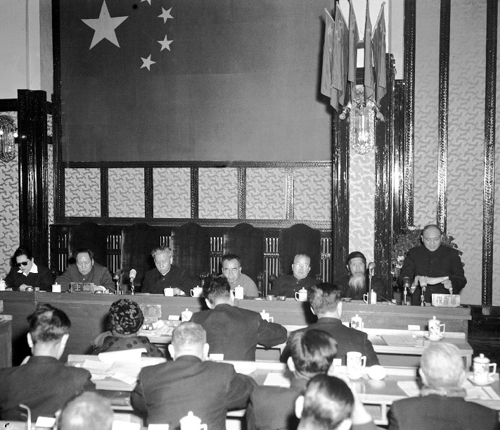1953年2月11日,中央人民政府委員會舉行第二十二次會議。鄧小平(右一)在會議上作關(guān)于中華人民共和國全國人民代表大會及地方各級人民代表大會選舉法的說明報告。主席臺上(自左起)宋慶齡副主席,毛澤東主席,劉少奇、朱德、李濟深、張瀾副主席。